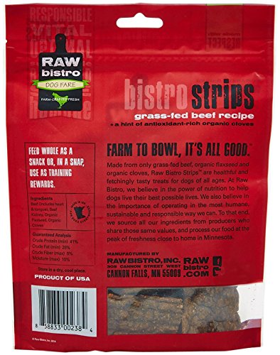 -. Binding : Misc. -. Brand : Raw Bistro -. Department : P.R.Ice Incorrect -. EAN : 0858833002384 -. Feature : beef from 100% grass-fed cattle pasture-raised on Midwest family farms without antibiotics, added hormones or grains - ever! / organic ground flaxseed rich in the essential Omega-3 fatty acid ALA to support a healthy heart, skin & coat / organic/fair trade cloves as a natural antioxidant / USDA inspected & approved human-grade ingredients / produced in small, custom batches at our own hyper-clean facility in Cannon Falls, Minnesota. -. Label : Raw Bistro -. Manufacturer : Raw Bistro -. Model : RB00238 -. MPN : RB00238 -. PackageQuantity : 1 -. PartNumber : RB00238 -. ProductGroup : Pet Products -. ProductTypeName : PET_SUPPLIES -. Publisher : Raw Bistro -. Studio : Raw Bistro -. Title : Raw Bistro Bistro Strips - Beef - 5 Ounces -. UPC : 858833002384