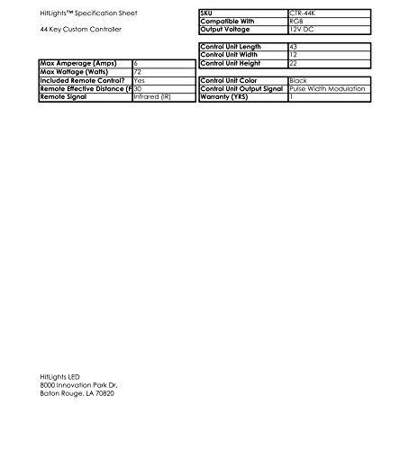 Studio : HIT International Consulting, LLC Publisher : HIT International Consulting, LLC Binding : Electronics Product Description The HitLights Color Changing LED Light Strip 44-Key Controller is a perfect solution for anyone looking for a lot of color options for LED light strips. The remote features 44 keys, with 20 pre-set color keys, 12 DIY color keys and 12 animation/function keys. The HitLights Color Changing LED Light Strip 44-Key Controller is rated for 72 Watts - or around 36 feet of our Standard Density RGB 5050 Light strip or 18 feet of our High Density RGB 5050 Light strip [search for HitLights 5050 LED] Product Features :? ? 20 Color Keys ? 12 DIY Color Keys ? 12 Animation/Function Keys