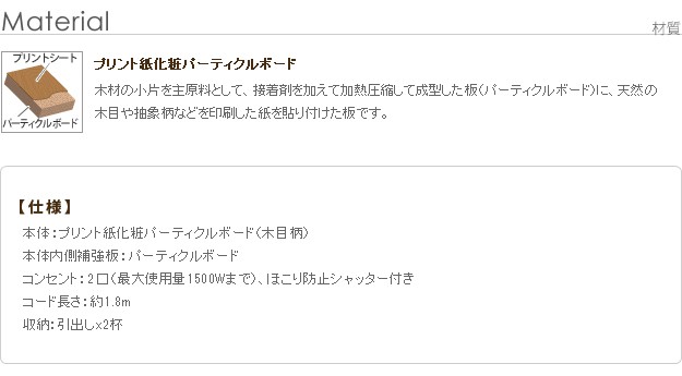 材質:本体-プリント紙化粧パーティクルボード(木目柄)、本体内側補強板-パーティクルボード、コンセント-2口(フタ付き)合計1500W・コード長1.8m