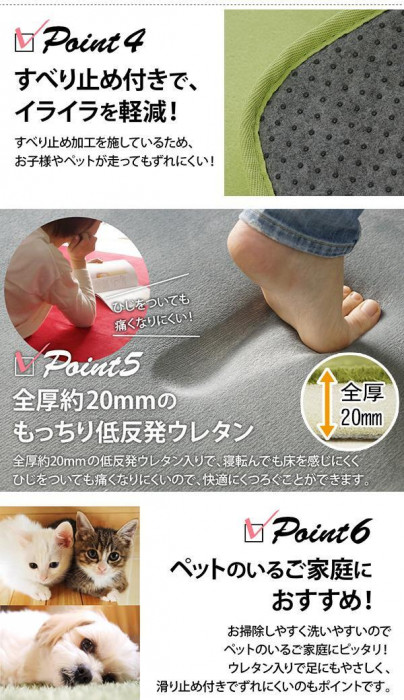 | 素材・材質 | 表地:ポリエステル100% 中材:低反発ウレタン15-13mm 裏面:不織布(すべり止め付き) |