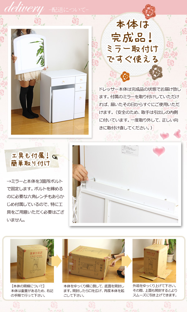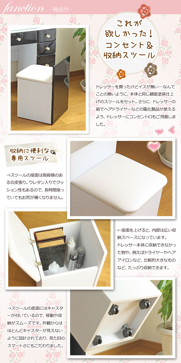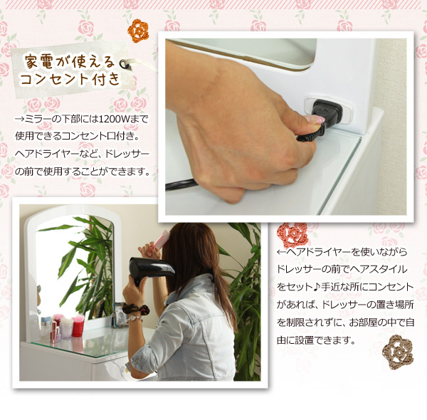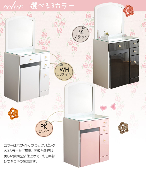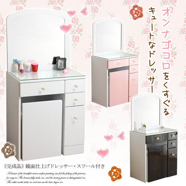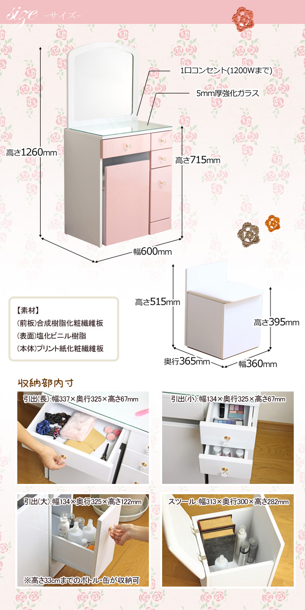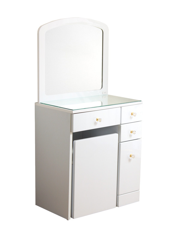 本商品はお取り寄せ商品のため、稀にご注文入れ違い等により欠品・遅延となる場合がございます。誠に恐れ入りますが、何卒ご了承ください。 また、以下の場合には追加送料がかかる場合がございます。  ・大型商品の複数購入時 ・同梱区分が異なる商品の複数購入時  【出荷目安】:1 - 5営業日 ※土日・祝除く 【同梱区分】:TS 2231 【梱包サイズ】:大型商品 【代引き決済】:不可  配送伝票の依頼主は出荷元(メーカーもしくは仕入元)名となる場合がございますので、お受け取りの際はご注意ください。   【型番】IW-190  オンナゴコロをくすぐるキュートなドレッサーをご紹介♪前板は鏡面塗装でツヤツヤの仕上がり☆引出しにはゴージャスなクリスタル調のキラキラ取手付きです!さらに便利なコンセント口も標準装備!専用のスツールもセット!本体は完成品で、ミラーを取り付けるだけの簡単仕様です♪   【サイズ】(ドレッサー本体)幅60×奥行40×高さ126cm (スツール本体)幅36×奥行36.5×高さ51.5cm(座面)高39.5cm  【材質】(本体)プリント紙化粧繊維板(前板)合成樹脂化粧繊維板(表面)塩化ビニル樹脂(天板)5mm厚強化ガラス  【生産地】台湾  【商品仕様】 耐荷重:天板10kg、引出し(長)(大)10kg、引出し(小)5kg、全体で40kgまで  1口コンセント付き(1200W)  スツール付き  本体は完成品(ミラー、取手のみ取付け)  【ご注意事項】 ・本商品は、北海道・沖縄・離島への配送はいたしかねます。あらかじめご了承ください
