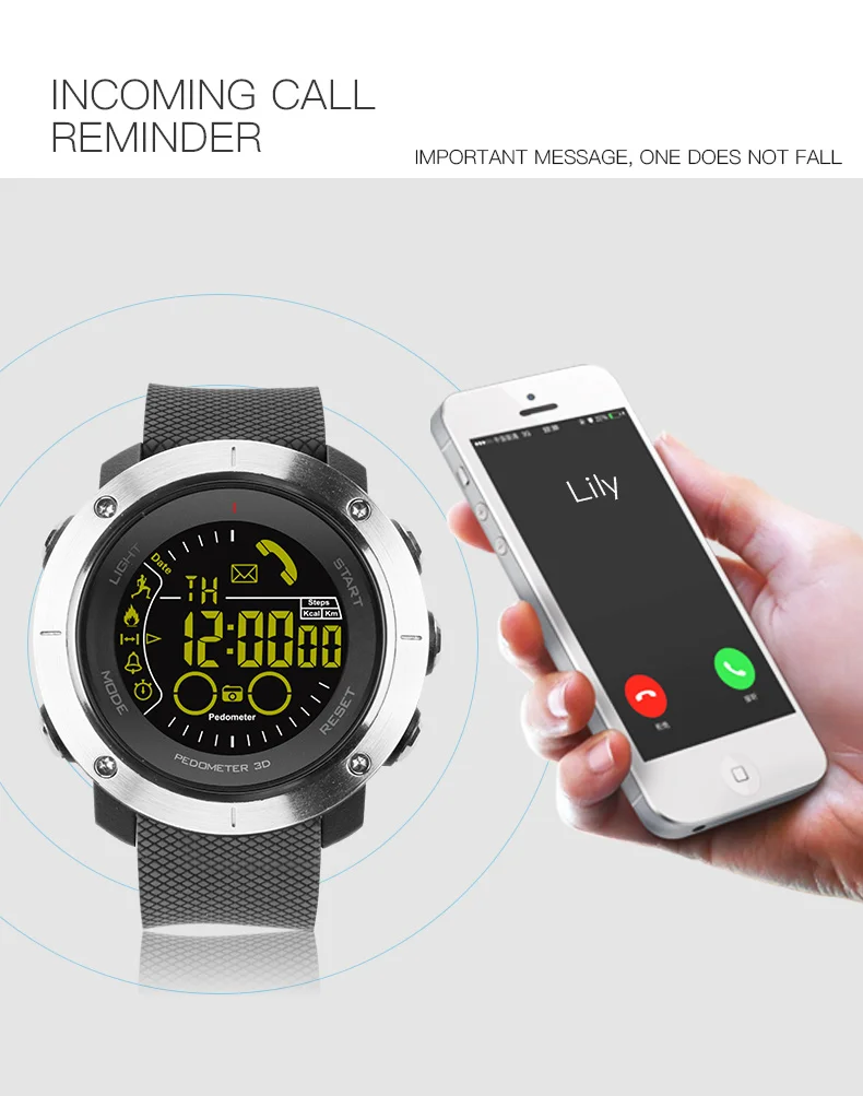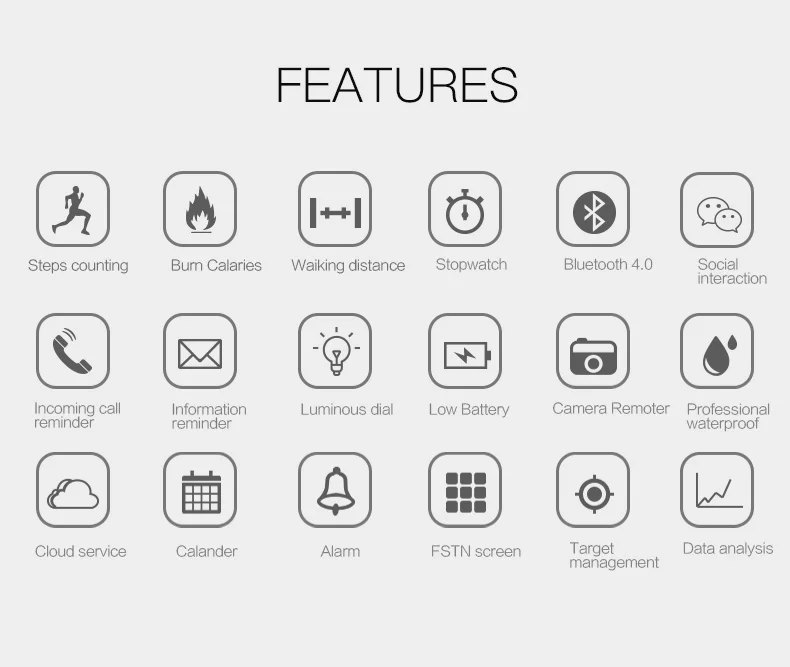 Function:Week,Message Reminder,24 hour instruction,Chronograph,Passometer,Alarm Clock,Noctilucent,Fitness Tracker,Call Reminder,Calendar,Remote Control