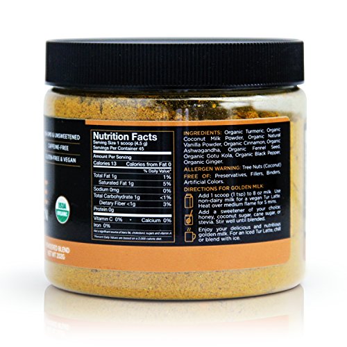 Enjoy the amazing taste and healing benefits of our turmeric golden milk in a delightful non-caffeinated latte. A nutritious supplement that is easy to take, our turmeric powder organic is pre-mixed in the right amounts with black pepper, gotu kola, ashwagandha, and warm aromatic spices. All you need to do is simply add a milk of your choice, and a sweetener if you desire.