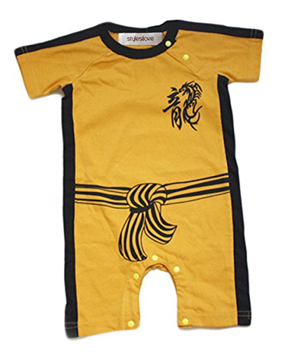-. Brand : StylesILove.com -. Department : baby-boys -. Feature : hand or machine wash cold water / a perfect outfit for your little prince! / 3 sizes: 6-12 months (17" length, 21" chest); 12-18 months (18" length, 22" chest) ; 18-24 months (19" length, 23" chest) / yellow and black colors / super cute and fun Bruce Lee Inspired dragon kung fu short sleeve costume jumpsuit -. ProductGroup : Apparel -. ProductTypeName : APPAREL -. Title : StylesILove Baby Boy Bruce Lee Inspired Costume Jumpsuit