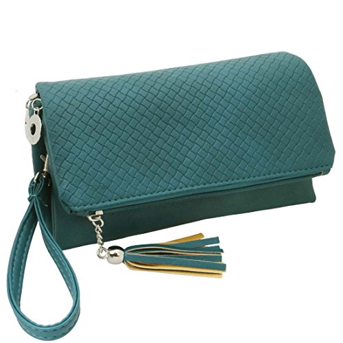 This small, deep aqua faux leather clutch may be the must have fashion accessory you have been looking for. The small handbag features a quilted, woven lattice pattern on the front flap and features 3 separate compartments. Each compartment is zipper sealed and features interior lining. This bag has enough room for your essentials, and the different compartments will help to keep you organized. Transition this clutch to a shoulder handbag or crossbody bag with the removable, adjustable strap. There is also an additional wrist strap that can be added to the bag to create that wristlet clutch look. The bag also features small touches such as the zipper tassel and the b.m.c branded logo patch on the interior. Definitely a great addition to any look. *NOTE*: Due to differences between monitor displays, actual color may vary slightly from image. b.m.c is a registered trademark of Remi Collections LLC and is exclusively distributed by Bundle Monster. The b.m.c trademark is protected by US Trademark Law.
