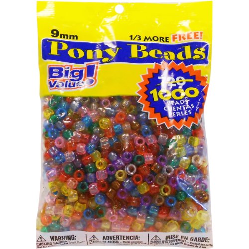 9mm plastic pony beads in assorted transparent colors. 1000 pieces per package. Beads are imported, size and color may vary.