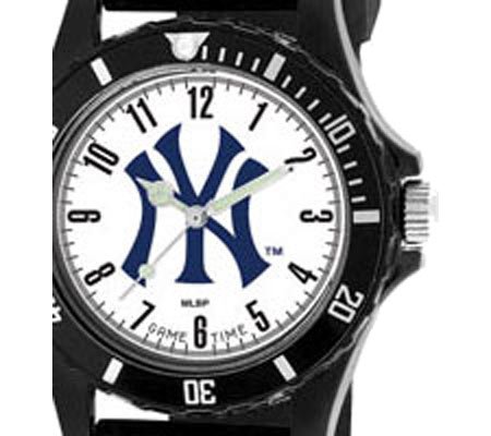 Round watch with New York Yankees logo on dial and black textured silicone band