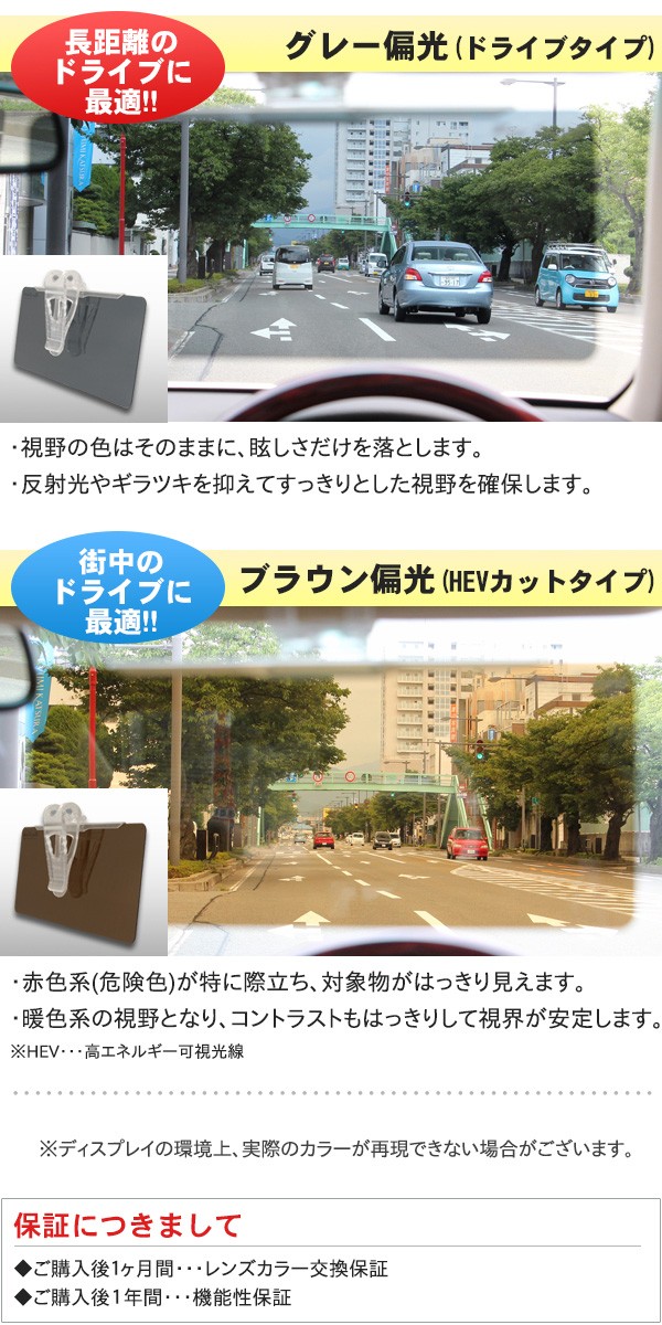 | 仕様 | 【グレー偏光】 可視光線透過率:約17%、紫外線カット率:99%以上、青色光線カット率:約82%、偏光度:約99% 【ブラウン偏光】 可視光線透過率:約19%、紫外線カット率:99%以上、青色光線カット率:約94%、偏光度:約99% |