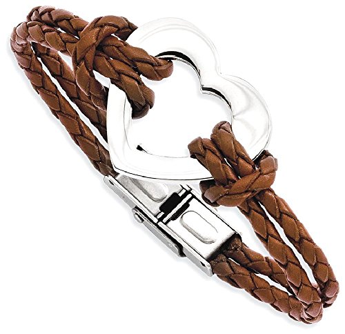 ICECARATS DESIGNER JEWELRY STAINLESS STEEL HEART 7.5 INCH LEATHER BRACELET 7.50 INCH