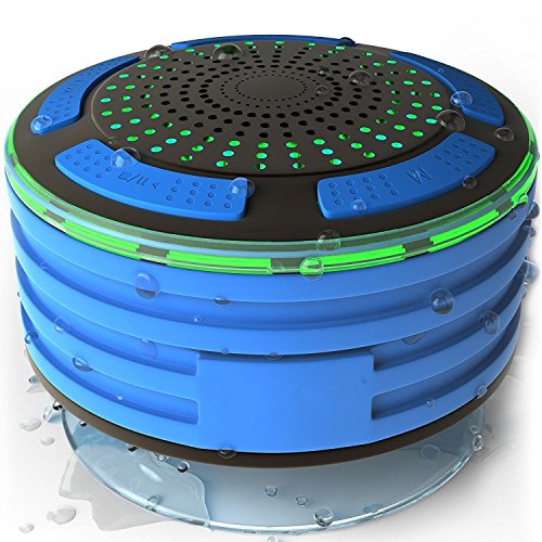 -. Feature : ► HIGHEST WATERPROOF DESIGN: An IPX7 certification rating makes this waterproof wireless speaker safe for the shower, beach, bathtub, boat, car, or indoor/outdoor party, so you can always listen to your music or FM radio stations! NEW FLOATING DESING: floating on the pool over 24 hours you can swimming and making the mini speaker follow you at the same time, and it not just waterproof but also SHOCKPROOF , DUSTPROOF & SCRATCHPROOF. / ► AMAZING SOUND QUALITY: Our ultra portable Bluetooth speaker offering rich, strong bass and crystal-clear treble sound. Powerful 5W drivers speaker, louder volume let you get dancing and singing in everywhere. / ► ULTRA PORTABLE: Each waterproof outdoor speaker also features a stable SUCTION CUP that lets you stick it to shower walls, car windows, desktops, bathroom tile, kitchen counters, and anywhere you want get. So you can anytime enjoy great music and handsfree calling especially when you are taking a shower. / ► BLUETOOTH 4.0 TECHNOLOGY: Simple fast connect to your favorite smartphone, tablet, iPod, iPad or other Bluetooth devices (Bluetooth V2.1 and over) from up to 33 feet away. It also an 4 colors BREATHING LED lights Bluetooth speaker, creating a dynamic and romantic music ambience, excellent for party, dating and dancing time. / ►SIMPLE PAIR and CONTROL:Connect your Smartphone,tablet,computer etc.via Bluetooth in less than 6 seconds. Mini lightweight and ultra- portable design, making it better than any shower head system. Great for the bathroom,showers,pool,boat,beach,kayak,patio or anywhere else; Easily adjust the volume, play and pause,skip songs forward and back,All controls are easily identified and accessible on the top of the device. It also acts as a Handsfree Speakerphone with a built-in mic for calling.