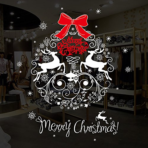 Bidlsbs White Merry Christmas Letter Reindeer Snowflakes And Red Bowknot Pattern Window Sticker-Ideal For Retail Store,Coffee House/Dress Shop Decorations...
