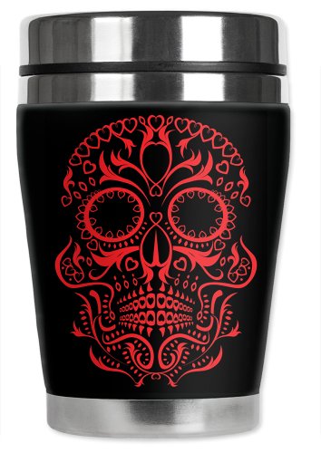 Mugzie Red Sugar Skull "Mini" Travel Mug with Insulated Wetsuit Cover, 12 oz, Black
