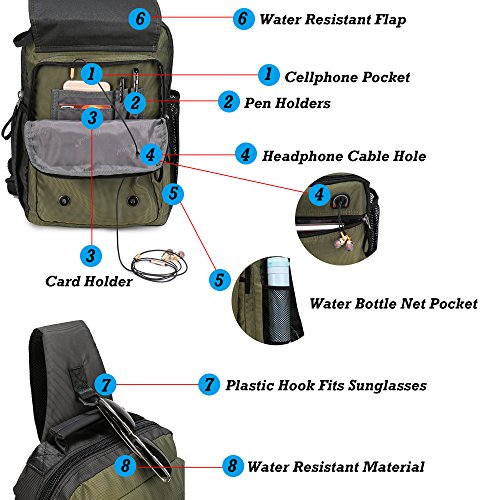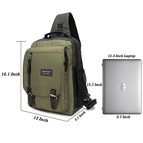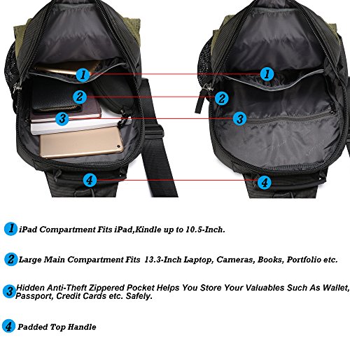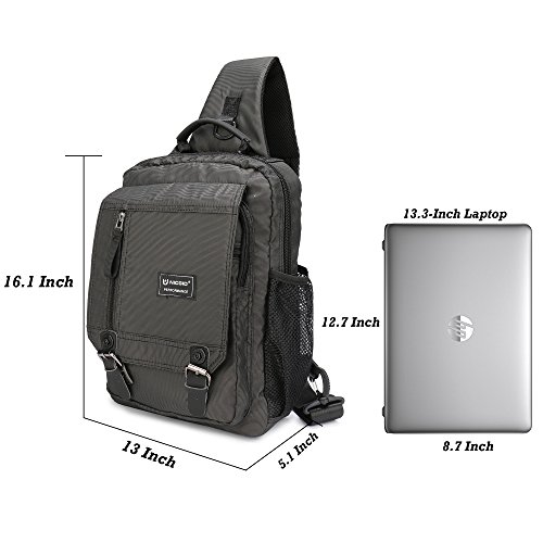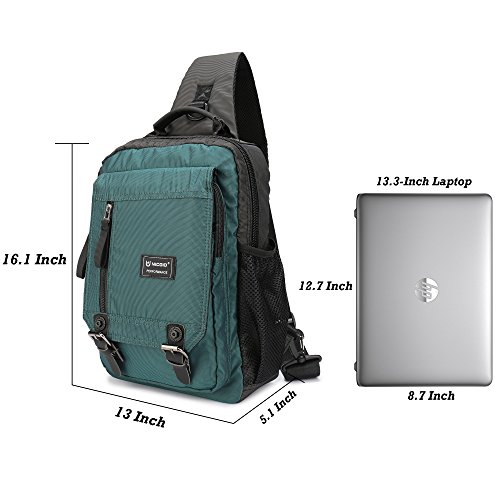 -. Feature : Material--Lightweight, High Quality Water Resistant Nylon Material. Adjustable Shoulder Strap are padded that is comfortable to wear. Top Carrying Handle with padded that would make a nice carry on for air flights. / Dimension--Size:13*5.1*16.1 inch (L*W*H). You can use it as a chest pack, shoulder bag, messenger bag, travel bag. It's not a large backpack. But it will fit both regular and plus-size person. Looking not big and not small on the back. / Internal--The large compartment with a iPad inner pouch and wallet holder fits laptops up to 13.3-Inch, 10.5-Inch iPad, wallet, passport, camera, umbrella, textbooks or even a lightweight jacket. / Exterior--3 Zippered Pockets on the front,1 Large Deep Pocket on the back,1 Meshy Side Bottle Pouch, 1 Side Elastic Pocket, 1 Padded Shoulder Strap, 2 Magnetic Buckles fit all your needs. / Practical--Great for commuting, travel, light hiking on the weekend, mountaineering, leisure or outdoor living and sports. Also trips to the outdoor theme park, amusement, ball games, city tour, music festival, diaper bag (carry around diapers and wipes).