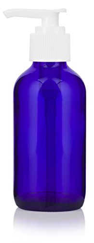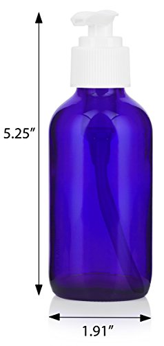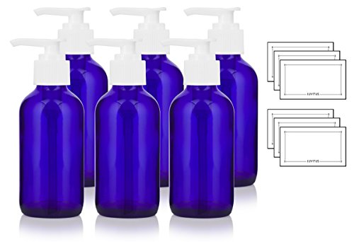 Cobalt Blue Glass Boston Round White Lotion Dispenser Pump Bottle - 4 oz (6 Pack) + Labels