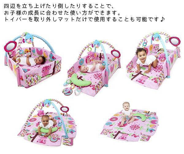 | 7つの楽しいおもちゃとピローがついた女の子に向けたキュートなプレイジム。赤ちゃんが心地よい気持ちになるポップサウンドも搭載♪ピンクの生地に、ことりやお花がデザインされた寝心地の良いマットは、四辺を立ち上げることができるので、お子様の成長に合わせて、5通りの使い方ができます。 |