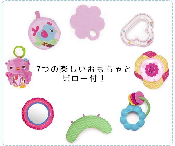 | セット内容 | マット、トイバー、ピロー、メロディトイ、ぬいぐるみ、歯固め、布製おもちゃ、チェイサー、ミラー、ラトル、おもちゃ取り付け用リング 取扱説明書 |