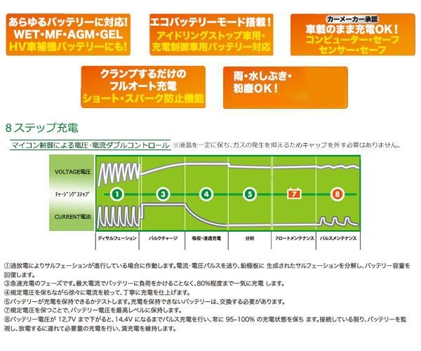 充電制御車用、アイドリングストップ車用、補機バッテリー対応のバッテリーチャージャーです。バッテリーを車載のまま充電でき、バッテリーキャップやマイナスケーブルを外す必要が無いため手間がかかりません。コンピューターやセンサーに影響を及ぼしません。バイクから小型マリン、農機具用に対応。 |