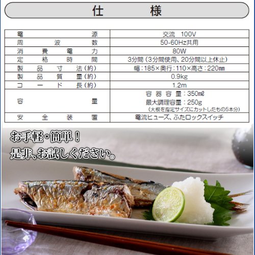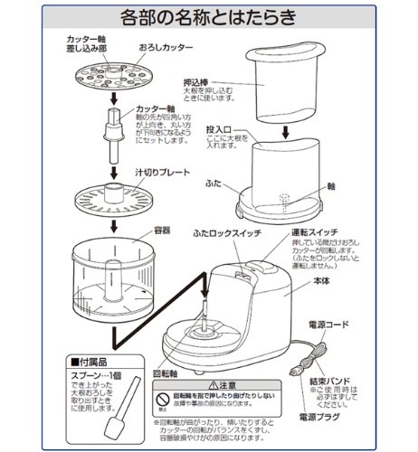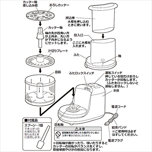 ●본체크기:폭18.5×(길이)깊이11×높이22cm 중량0.9kg●전원:교류100V●소비전력:80W●정격시간:3분(3분간 사용,20분간 이상 중지)●내려 시간:약10초(무우 약100g)●코드장:1.2m●용기 용량:350ml●최대 조리 용량:250g(무우를 지정크기로 컷 한 것5본분)●안전장치:뚜껑 록 스위치(상뚜껑이 완전히 꼭 닫혀 있지 않은 상태에서는 전원이 들어 가지 않는다)●힘 있지 않고 편안히 무우 내리기●산마 등 생선구이에 첨부하거나 그러면 청하 # 물건(물품,품질) 어느 등이 무쳐 것에●부속 즙송곳 플레이트를 붙이면 섬유와 내리기즙을 분리 할 수 있는【주의사항】●화상은 이미지 입니다.●개봉 후의 반품은 거절하겠습니다.●일,축배달,시간 지정 불가입니다.