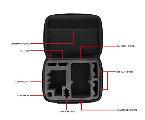 Case Features: Durable and Water Resistant Nylon Shell, High-Density Foam Padded Interior, Perfectly Shaped Compartments for your GoPro and Accessories, Comfortable and Supportive Carry Handle, Adjustable Shoulder Strap and Belt Loop
