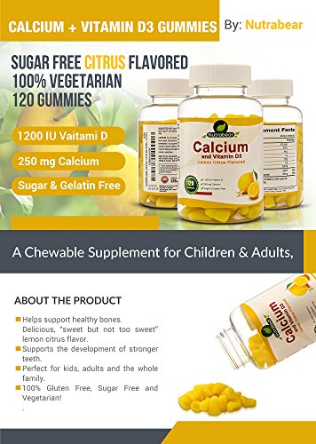 Nutrabear's "Calcium and Vitamin D" gummies contain 1200IU of Vitamin D and 250mg of Calcium, more than enough to fulfill your daily RDA. These tasty chewable treats are perfect for the whole family. These gummies are formulated for both children and adults.