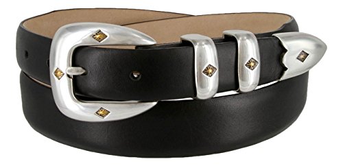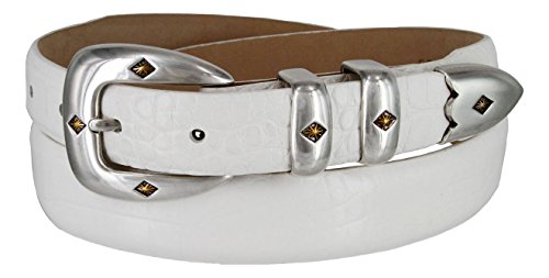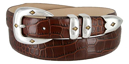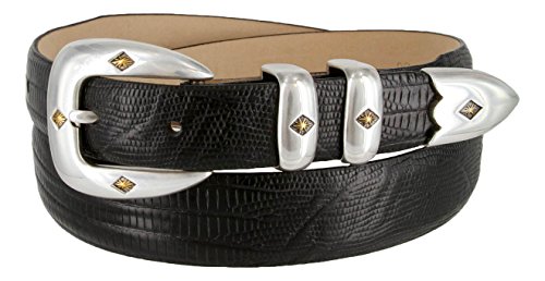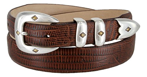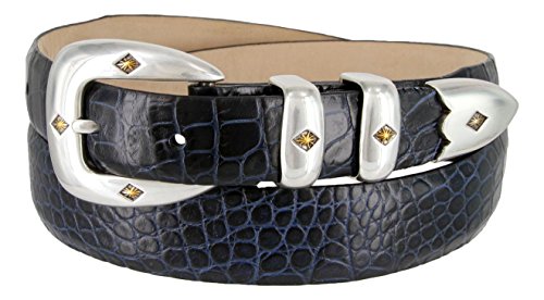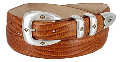Binding : Apparel Product Description Classic Sleek Silver finish buckle enhance by a gold diamond center. Supple Genuine Italian Calfskin Leather belt. Double matching metal keepers and tip. 1-1/8"(29mm) tapers down to 1"(24mm) at Buckle and Tip end. Available in colors: Alligator Black, Alligator Brown, Alligator Tan, Alligator Navy, Lizard Black, Lizard Brown, Lizard Tan, Smooth Black, Smooth Brown, and Alligator White. Sizes available: 32"(81cm), 34"(86cm), 36"(91cm), 38"(96cm), 40"(101cm), 42"(106cm), 44"(111cm), 46"(117cm), 48"(122cm), 50"(127cm), 52"(132cm), 54"(137cm). Sizing: Measure around where you wear the belt, with your pants on, and order closest to that size. 0