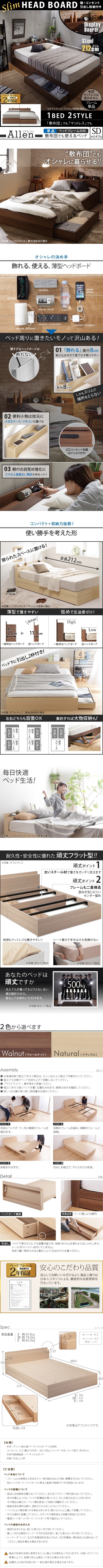 ●ベッドフレームのみ 省スペース スリムヘッドボード 2口 コンセントカバー