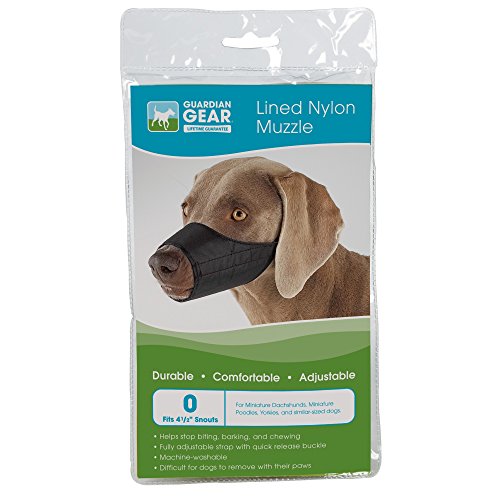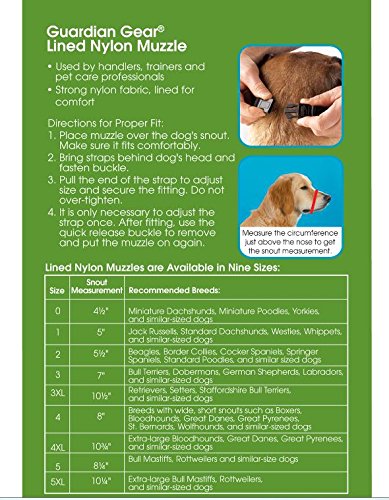 Studio : PetEdge Dealer Services Publisher : PetEdge Dealer Services Binding : Misc. Product Description For safety when working with biting and chewing dogs, our Guardian Gear lined muzzles are the choice of top handlers, trainers and other professionals. With a fully adjustable strap and quick-release buckle, each muzzle is crafted in strong nylon fabric, lined with chafe-free inner seams for comfort. Muzzle stays in place on dogs, but it has a snap for people to remove and replace. Available in black color. 0 size muzzle fits dogs with 4-1/2-inch snout. Measures 7-4/5-inch length by 4-4/5-inch width by 4/5-inch height. 0