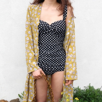 사랑스러운 도트 원피스수영복이예요! 사진상으로 스커트라인이 올라가서 잘 표현이되지않았지만, 커버원피스를 내려입으면 힙부분을 자연스럽게 가려주는 디자인이예요. 조금 더 섹시하게 연출하고 싶으시면 사진처럼 올려서 입으시면 되세요.