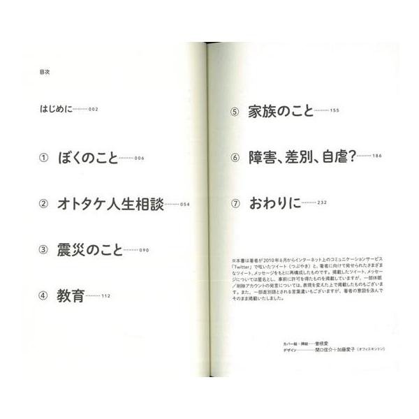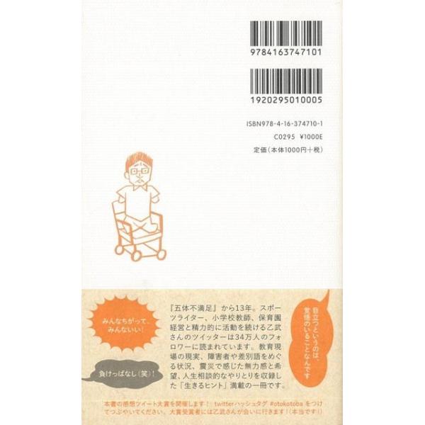 【商品説明】 定価(税込み):1,080円 値引き:10% OFF 乙武さんのツイッターは、2011年11月現在、34万人のフォロワーに読まれています。そのフォロワーたちとのやりとりから生まれた本書は、教育現場の現実、障害者や差別語をめぐる状況、震災で感じた無力感と希望はもちろん、フォロワーとの人生相談的なやりとりを収録した、「生きるヒント」満載の一冊です。 バーゲンブック 新品 特価 格安 エンターテインメント タレント ミュージシャン TV 教育 | |