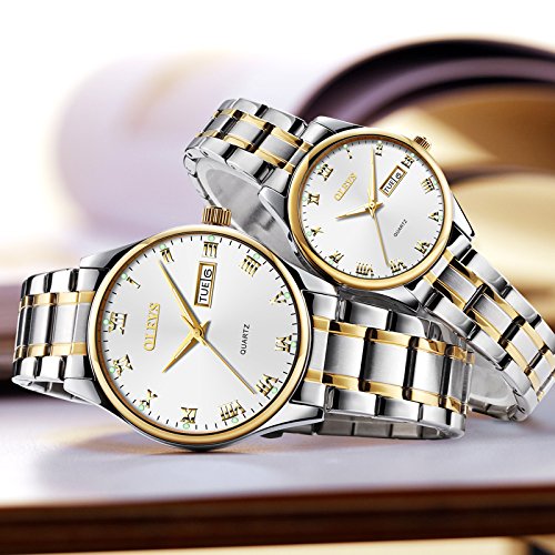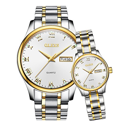 OLEVS 2Pcs Women & Men Day-Date Windows & Luminous Titanium Steel Band Quartz His & Her Couple Wrist Watches, Valentines Gift