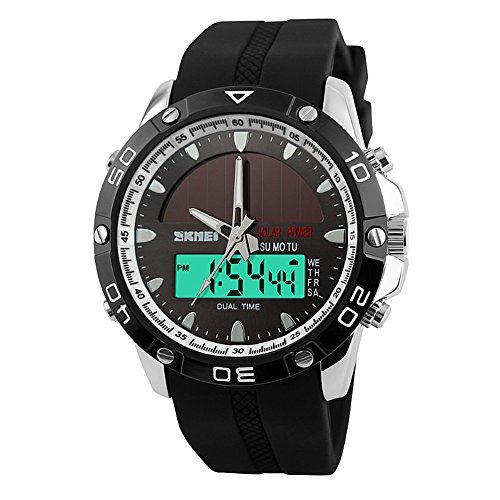 -. Feature : UNIQUE CASAUL SPORTY DESIGN: Light weight silicone strap with big face sports watch and fashionable appearance bring you the fashion and simplicity, makes you feel comfortable and provide you with a good wear resistant. / DIGITAL WATCH WITH MULTI-FUNCTIONAL MODE: Designed with chronograph and alarm function, week to read and double time setting, shock resistant perfect as a sport watch and casual watch. Backlight can be seen in the night or dark places, easy to read time, also can be used as a military watch. / SOLAR POWERED WATCH: Digital watch with solar panel, perfect be used as a outdoor watch for camping hiking and cycling. No worry for powers run away. / WATER RESISTANT WATCH: 50M(164FT) water resistant for daily use, can be convenient as a everyday watch. / COME WITH A GIFT BOX, can wear it own or can be given as a gift for Birthday, Valentine's Day, and Christmas.