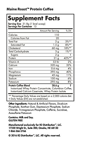 ReleaseDate : 2017-01-03 Studio : Complete Nutrition, LLC Publisher : Complete Nutrition, LLC Binding : Grocery Product Description Maine Roast Protein Coffee contains the purest natural coffee beans paving the way to a wonderfully delicious drinking experience. The natural aroma, and favor is derived from the Colombian sourced coffee beans which are then roasted in Maine. Combining the highest quality coffee beans and roasting techniques, leads to the barista experience you can prepare in the comfort of your own home! In addition to our high quality coffee beans, we have added premium whey protein which makes your coffee as nutritious as it is delicious. 0