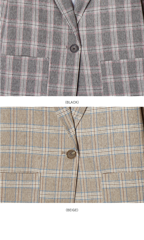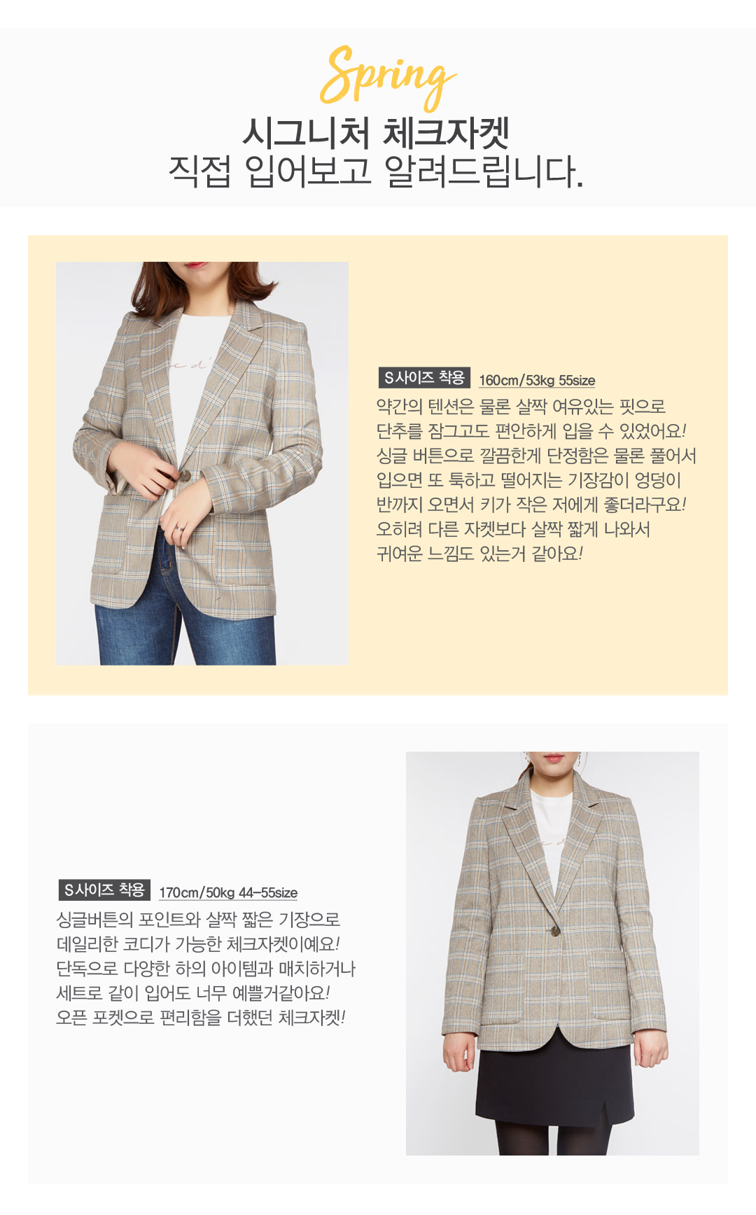 - 어떤 아이템과도 잘 어울리는 톤과 여유있는 핏으로 데일리로 쉽게 입을 수 있는 체크자켓입니다.