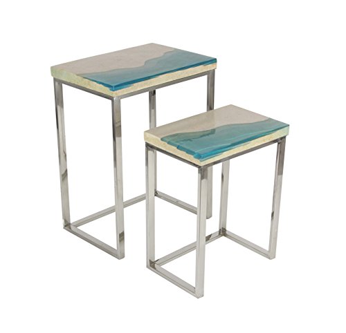 -. Feature : Set Of Two 21 inches, 27 inches Modern Reflections Stainless Steel Polystone End Table, Rectangular Stoneware Table Tops With Glazed Blue And White Design / Clear Acrylic Accents / Silver-Finished Stainless Steel Frame And Closed-Type Legs