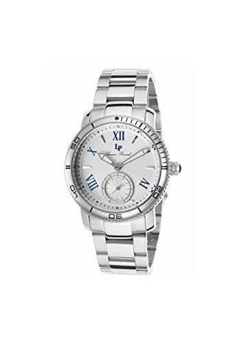 Classic, time-honored dimensions for today's woman from the Lucien Piccard Misty Rose collection. Transitional women's timepiece is sleek and appealing with a handsome round shaped case in your choice of stainless steel, rose and yellow gold-tone stainless steel presented on a matching triple-link bracelet. The decorative fluted crown is topped with a cabochon-cut blue stone for added distinction. The bezel with a coin-edge rim surrounds the legible dial with a small-seconds subdial, outlined sword hands, Roman numeral and polished hour markers.Feature