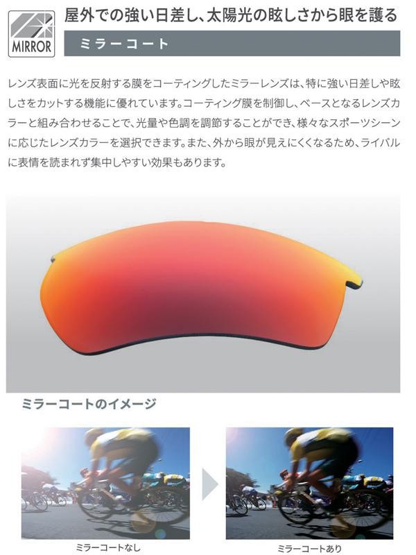 | 仕様 | フレームカラー:ブラック×ブラック×ブラック レンズカラー:レッドシャドーミラー×スモーク 可視光線透過率:24% 紫外線透過率:0.1%以下 レンズ:8カーヴ レンズ交換可能(別売) |
