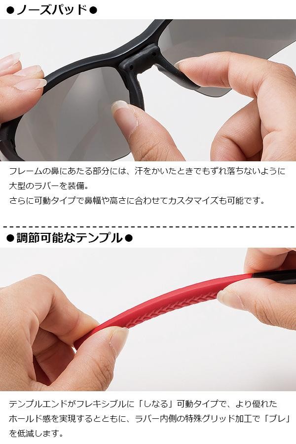 | 高い剛性と装着バランスを兼ね備えたフレーム設計。テンプルエンドがフレキシブルに動くので、頭部の形状に合わせて調節が可能。頭を包み込むようなフレーム設計のためズレにくく、締めつけないフィッティングを実現します。鼻パッドは汗をかいてもずれ落ちにくい素材を採用。レンズ交換機能付き。(スペアレンズは別売です。) |