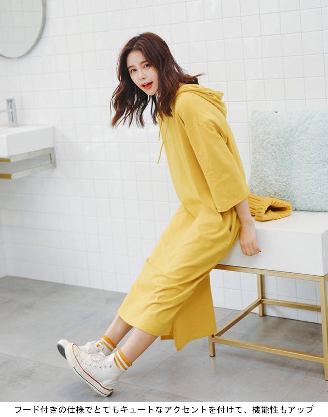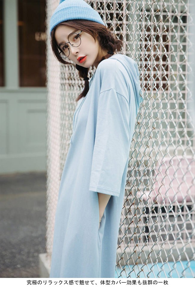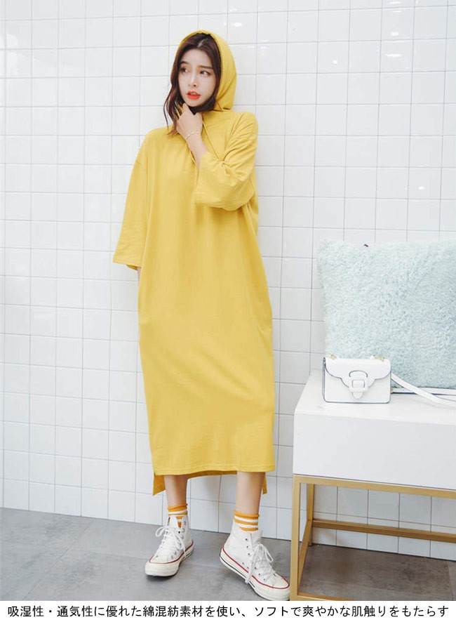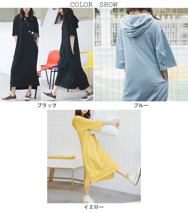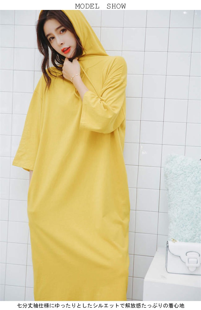 ロングワンピ フード付き 七分丈袖 レディース パーカー ロングTシャツ 体型カバー 女性用 マキシ丈ワンピース ゆったり Tシャツワンピレディース用のTシャツワンピが登場七分丈袖仕様にゆったりとしたシルエットで解放感たっぷりの着心地吸湿性・通気性に優れた綿混紡素材を使い、ソフトで爽やかな肌触りをもたらすフード付きの仕様でとてもキュートなアクセントを付けて、機能性もアップドロップショルダーのデザインに大きめのサイズ感でカジュアルなファッションスタイルを演出究極のリラックス感で魅せて、体型カバー効果も抜群の一枚カラー:ブラック ブルー イエロー素材 綿混紡サイズ(cm) M LM 総丈116 バスト110L 総丈117 バスト116ご注意:※サイズは平置きサイズです。素人採寸ですので、若干の誤差がございます、ご了承ください。