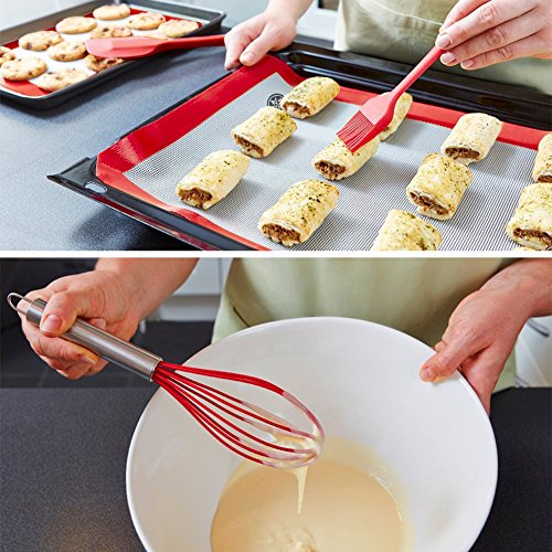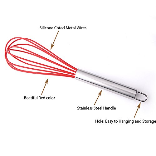 - MULTI-FUNCTION:These baking utensil set have a perfect for frying eggs,flipping pancakes and so much more,the whisk can be used as an egg beater,or to blend ingredients,flavoring into a mixture.and one basting brush to to spread butter, oil or glaze on dough, food or pastry.the lager and small spatula mix ingredients into the mixture during baking.