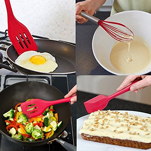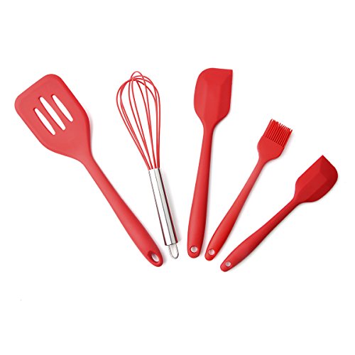 Silicone Baking Utensils Set Heat-Resistant Hygienic Solid Coating Spatula Set Slotted Turner Spatula Whisk Brush Scraper Non-Stick Mixing Cooking Kitchen Utensils Set 5 Pieces (Cherry Red)