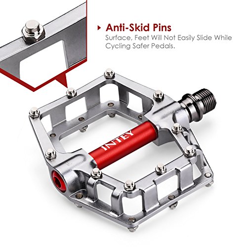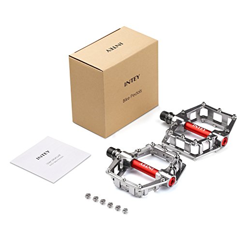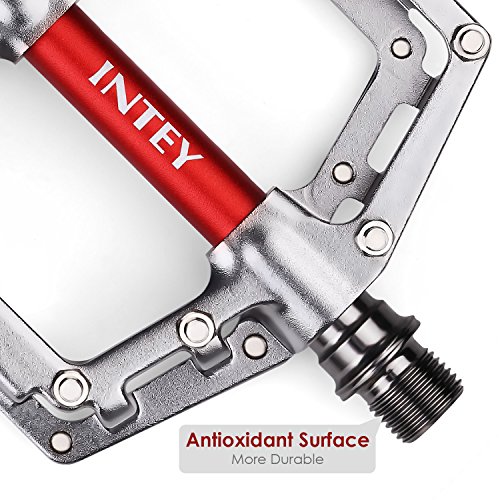 HEAVE-DUTY CONSTRUCTION: Unlike other welded bike pedals or simply assembled with screws and pins ones, INTEY aluminum bike pedals adopt hollow design came from one entire aluminum alloy body, providing an even more stable and longer performance than the others. Durable aluminum body, CNC Cr-Mo spindle with antioxidant surface and chrome molybdenum steel shaft 9/16". The flat mountain bike pedals feel beyond solid and will last a long time through all his trail riding craziness.