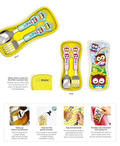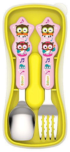 Edison Kids Straight Edge Spoon & Grooved Noodle Fork Set with Case (Pink)