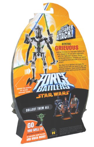 -. Binding : Toy -. Brand : Star Wars -. EAN : 0076930853559 -. Feature : Includes: GENERAL GRIEVOUS with 2 Green Lightsabers, 2 Blue Lightsabers and Grappling Hook with Launcher / Figure measured approximately 6-1/2 inch tall / Produced in year 2005 / For age 4 and up -. Label : Hasbro -. LegalDisclaimer : Ships to US -. Manufacturer : Hasbro -. Model : 85355 -. MPN : na -. PackageQuantity : 1 -. PartNumber : na -. ProductGroup : Toy -. ProductTypeName : TOYS_AND_GAMES -. Publisher : Hasbro -. Studio : Hasbro -. Title : Star Wars Year 2005 Force Battlers Series 6-1/2 Inch Tall Action Figure - GEN... -. UPC : 076930853559