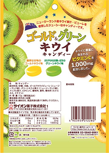 原材料:砂糖、水飴、ゴールドキウイピューレ(ニュージーランド産)、グリーンキウイ果汁(ニュージーランド産)、アップル果汁、ビタミンC、酸味料、香料、着色料(モナスカス、クチナシ)