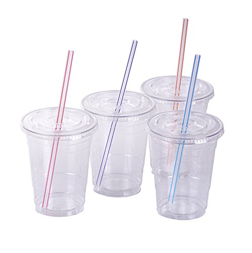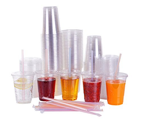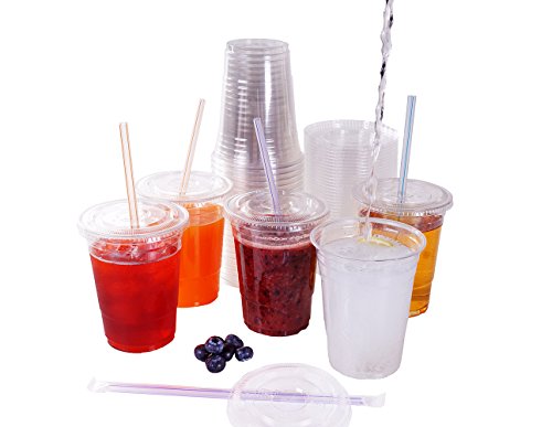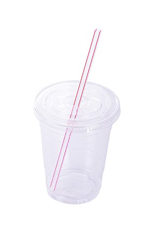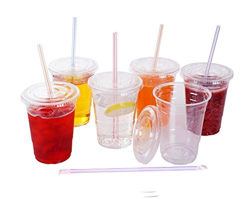 16 oz clear plastic cups with flat lids and individually wrapped straws - set of 100