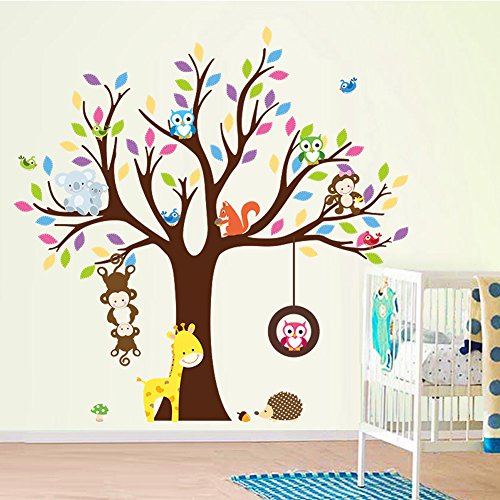 -. Title : Witkey Cartoon Forest Animal Monkey Owls Fox Hedgehog Rabbits Tree Swing Nursery Wall Stickers Decals Murals DIY Posters Vinyl Removable Art Wall Decals for Kids Children Home Decoration