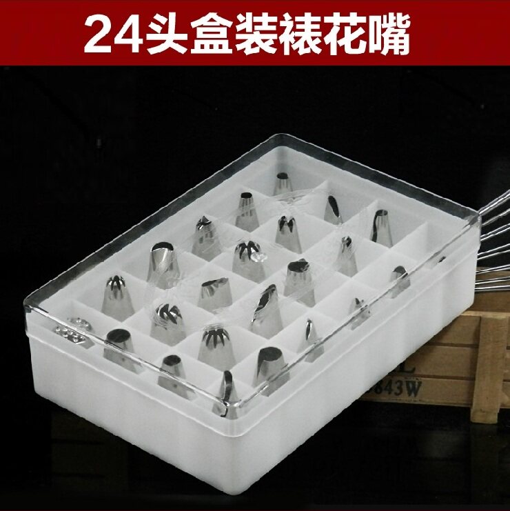 包括24个约中号裱花嘴——圆形裱花嘴、曲奇花嘴、叶子花嘴、玫瑰花嘴等.......(ps:需要同时用上大,小号两种花嘴转换器)