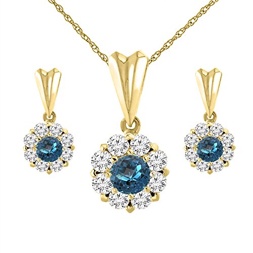 -. Binding : Jewelry -. Brand : Sabrina Silver -. Department : womens -. Feature : 14K Solid Gold / Naturally-vibrant, superior quality color gemstone / High Quality Genuine Diamond Accents / Complimentary gold chain included -. ProductGroup : Jewelry -. ProductTypeName : FASHIONOTHER -. Title : 14K Yellow Gold Natural London Blue Topaz Earrings and Pendant Set with Diamond Halo Round 4 mm