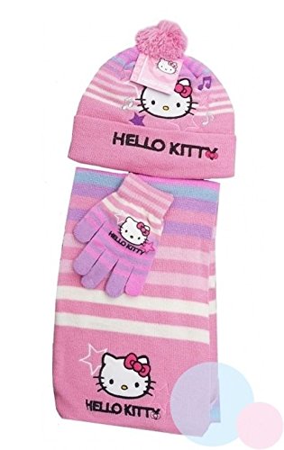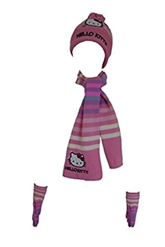 Cute embroidery of Hello kitty on hat scarf and gloves.