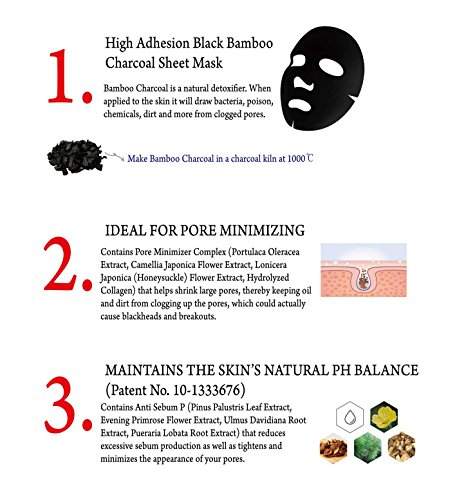 -. Feature : POWER TO ABSORB IMPURITIES AND TOXINS - Bamboo Charcoal is a natural detoxifier. When applied to the skin it will draw bacteria, poison, chemicals, dirt and more from clogged pores. The best part is that bamboo charcoal isn't harmful or to harsh on the skin, like a toner or exfoliate can be when used in excess. High adhesion black sheet mask. / IDEAL FOR PORE MINIMIZING - Contains Pore Minimizer Complex (Portulaca Oleracea Extract, Camellia Japonica Flower Extract, Lonicera Japonica (Honeysuckle) Flower Extract, Hydrolyzed Collagen) that helps shrink large pores, thereby keeping oil and dirt from clogging up the pores, which could actually cause blackheads and breakouts. / MAINTAINS THE SKIN'S NATURAL PH BALANCE - Contains Anti Sebum P(Pinus Palustris Leaf Extract, Evening P.R.Imrose Flower Extract, Ulmus Davidiana Root Extract, Pueraria Lobata Root Extract) that reduces excessive sebum production as well as tightens and minimizes the appearance of your pores. Sebum control & pore cleaning effect. / EXCELLENT ANTISEPTIC AND ANTI-INFLAMMATORY PROPERTIES - Thanks to Lonicera Japonica (Honeysuckle) Flower Extract's excellent antiseptic and anti-inflammatory properties, it works wonders to relieve skin rashes, poison ivy and blemishes. Additionally, it is also used to get relief from sun burns and other minor burns that occur on your skin. / HYPOALLERGENIC AND DERMATOLOGIST TESTED - Offers clinically proven results. With powerful active ingredients in pore treatment, shrink & minimize your pores naturally. Clear and prevent clogged pores lead to acne, breakouts and blackheads. Improve the skin texture and keep your skin soft, supple and moisturized with anti-wrinkle effect. Korean Beauty.
